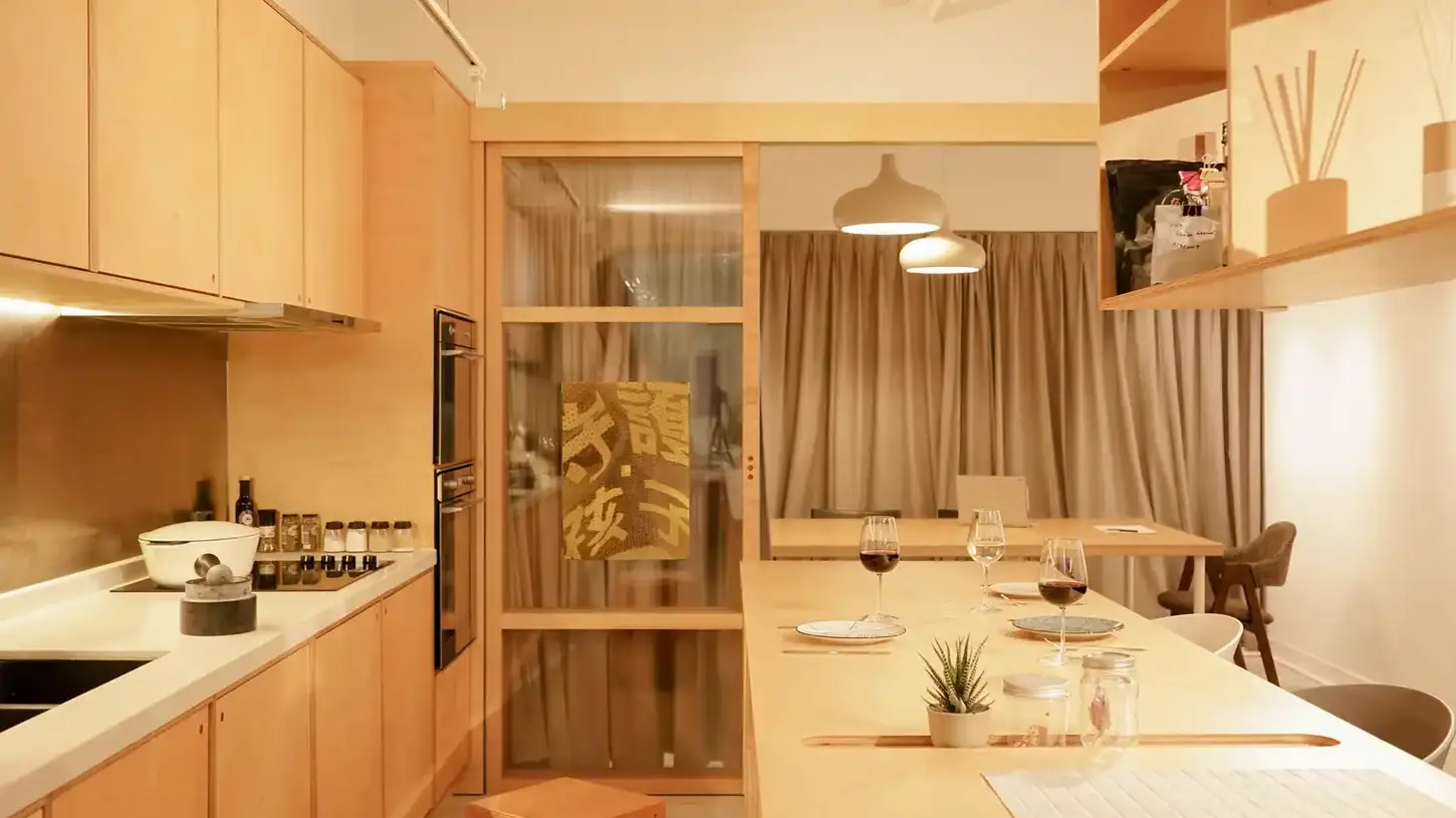 The design aims to keep the living room large and plain while bringing in natural elements to create a relaxed and calm environment. However, the client is not willing to take care of any living plants and therefore we chose rattan, which is a famous product in nearby Guangdong, as the key material for the living room. They are used on cupboard doors where their porosity and light colour help soften the cupboard’s existence. The outcome is simple, airy and comfortable.
