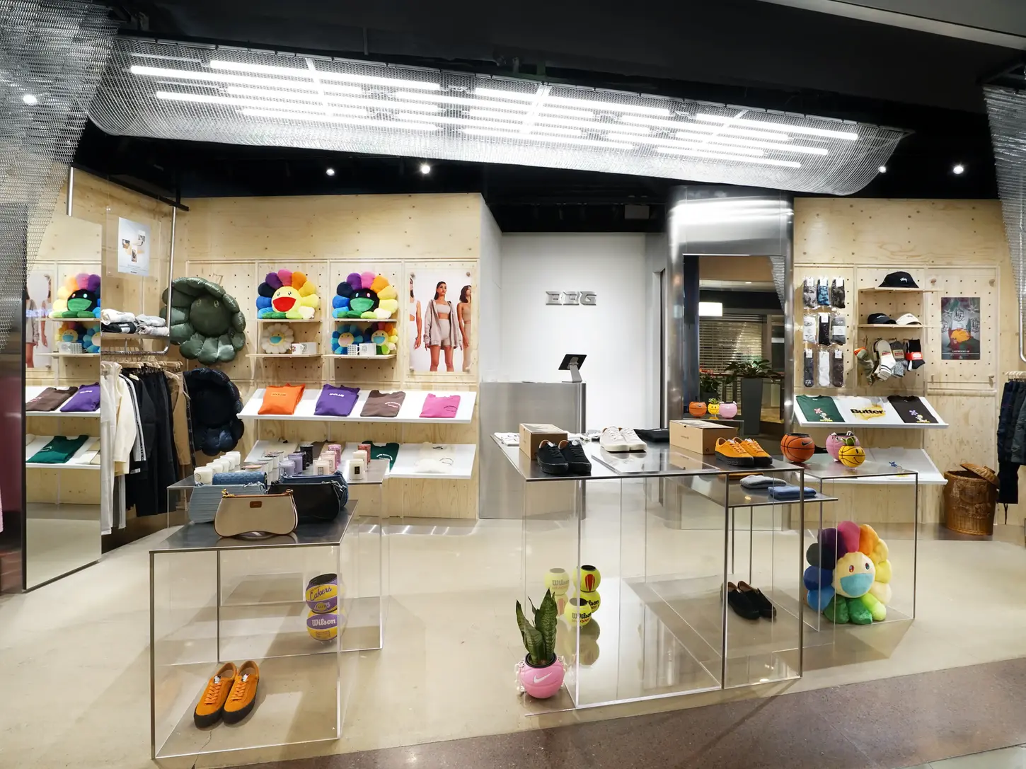 Customers can peek through the mesh to see the merchandise, and the mesh light provides enough lighting to the central display tables. The mesh also gives the client flexibility for display, such as hanging posters for events. Plywood was used to complement the metal mesh and prevent the space from looking too cold. BBG believes that the physical shopping experience will become more experiential and enjoyable in the future, which is why they invested in physical stores.