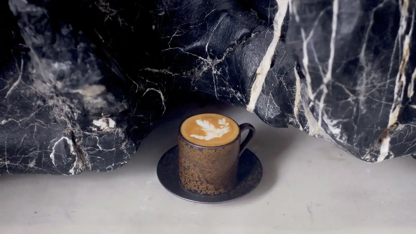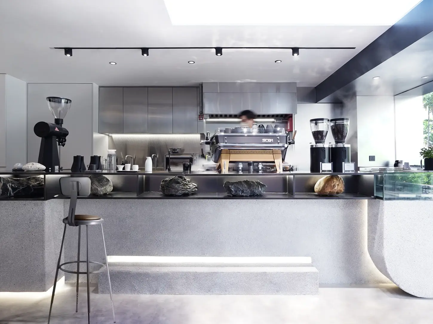 The design transformed the typical signage area of the facade into a row of triangular ridges with two materials each representing a trade of the boutique. The ridges indeed took reference from the characteristic hexagonal columnar rock formations of Hong Kong and were transformed into a symbol of local culture. Black stainless steel forms one side of the ridges and gives a cool and mechanical look; while washed concrete with exposed aggregate forms the other side and helps balance the coolness by giving a relatively warm and earthy tone. Stainless steel took reference from scissors of the hair-dresser while exposed concrete represents a mixture of minerals contributing to the delicate flavour of coffee. The two elements help balance and complement each other.