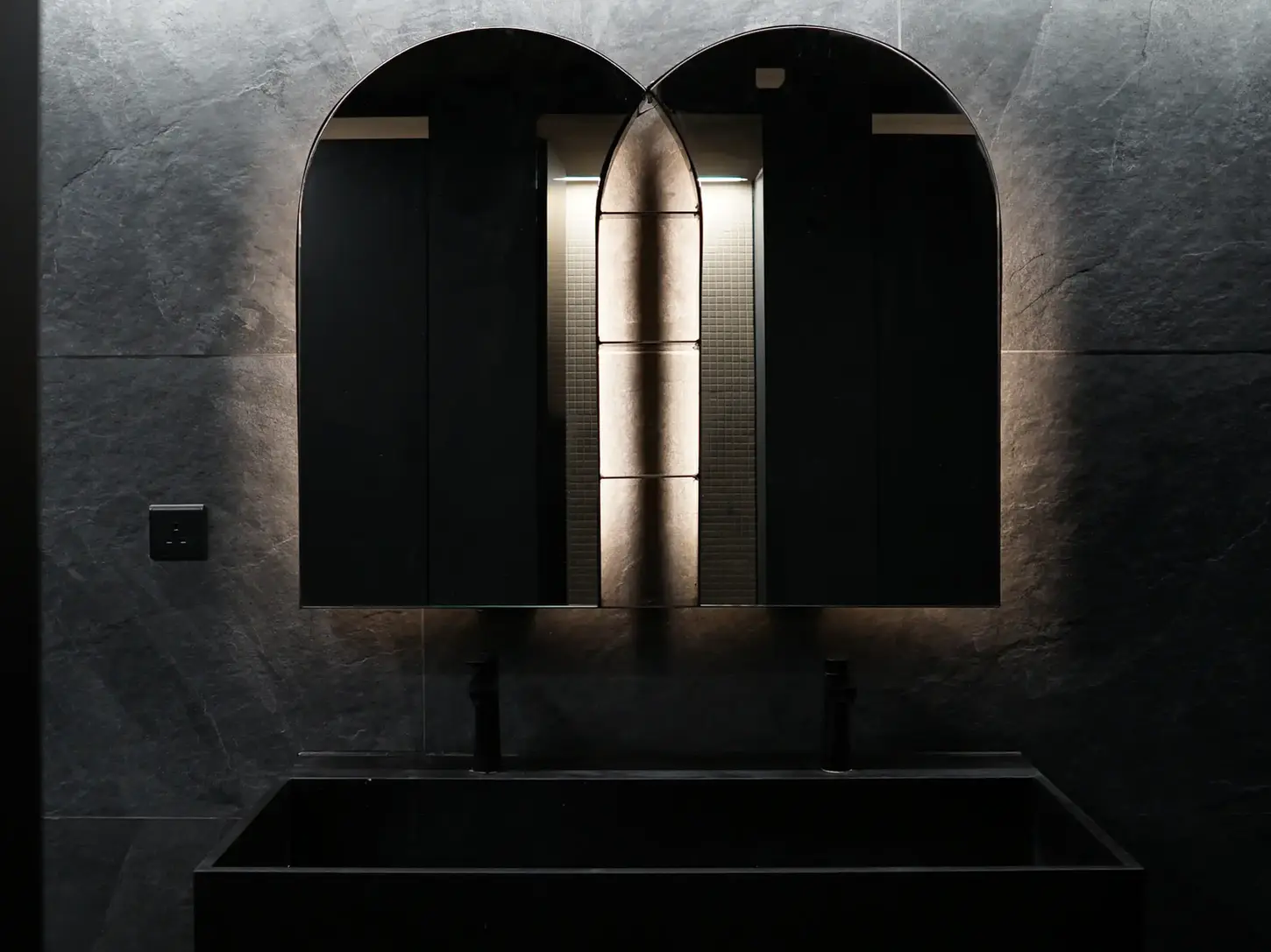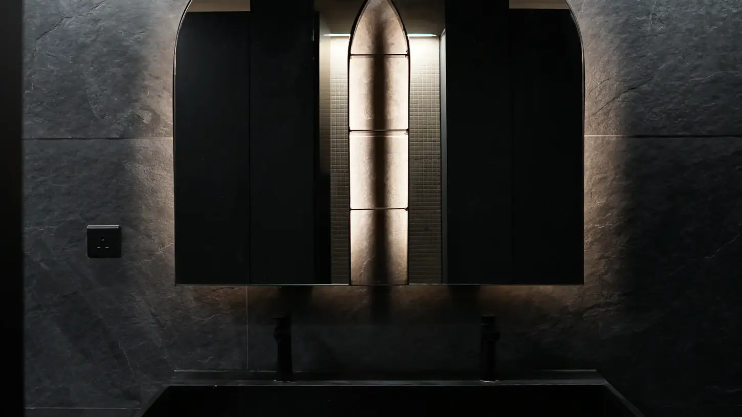 The court has strong stainless steel metal meshes along the surroundings to protect the windows and the audience sitting in the corridor. The bathroom uses black stone as the wall finish to provide a general dark atmosphere with diffused LED lights coming from the feature mirror cabinet, while the club amenity room has wood elements and warmer spot lights. The football court is a good example of revitalizing old industrial buildings in Hong Kong and a special place for the client and his friends to exercise and socialize.